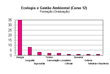 A formação acadêmica dos alunos matriculados no curso 12 teve uma dominância de biólogos sejam eles bacharéis ou licenciados. No entanto, o nosso público alvo é formado por nove tipos de cursos de graduação. Notamos, nesse curso uma concentração de alunos provenientes de mais três áreas: Geografia, Engenharias e Turismo.