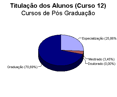Do total de alunos matriculados, dezessete alunos declararam haver cursado (ou estarem cursando) algum tipo de curso de pós-graduação. Quinze alunos estão cursando ou cursaram um curso de especialização e dois alunos declararam possuir o título de mestrado (PG sensu strictu ). A grande maioria dos alunos, no entanto, possui apenas o título de graduação.