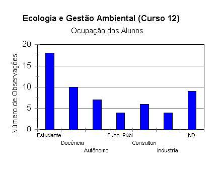 A maioria dos alunos matriculados no curso 12 foi composta por estudantes, principalmente os graduandos. Muitos alunos declararam estarem presentes neste curso como forma de preparo para algum exame de seleção a curso de PG na área de Ecologia. No entanto, uma parcela não desprezível de nossos alunos já possui uma atuação profissional definida tal como o ensino (docência) de segundo e terceiro graus, atuação em órgãos públicos (universidades particulares, secreataria de meio amibente de algumas prefeituras, etc. O curso 12 também teve um contingente relativamente grande de profissionais autônomos, muitos deles atuando como micro-empresários nas áreas de ecoturismo (aliás uma tendência que se mantém em relação ao curso anterior) e meio ambiente.