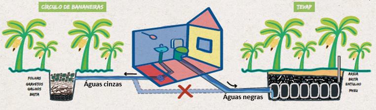 Um pré-requisito para o uso do TEvap é a separação das águas servidas na casa. Apenas aquele efluente advindo dos sanitários (águas negras) deve ir para a fossa TeVap. As demais, provenientes de pias e chuveiros (águas cinzas), devem ir para o “círculo de bananeiras”. A introdução do conceito de separação na fonte da gestão dos esgotos municipais permite o adequado tratamento de diferentes tipos de efluentes de acordo com suas características. Esta é a chave de soluções técnicas para o reuso eficiente da água, energia e fertilizantes.