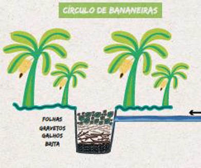 Os círculos de bananeiras (Figura 2) são elementos complementares às fossas de evapotranspiração (TeVap) na função de tratar localmente as águas cinzas. Consiste em um grande buraco em formato de bacia, com 1,5m de diâmetro e 1,2m de profundidade para uma casa de uma família (em torno de 4 pessoas) rodeado de plantas (bananeiras).
