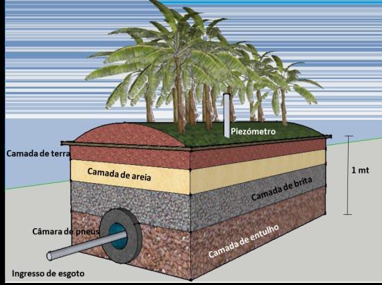 por morador da casa. O interior deverá ser revestido pelo método de ferro-cimento e argamassa. A Câmara Anaeróbia, é composta por um túnel de pneus usados que cria um ambiente para a proliferação de bactérias que quebrarão os sólidos em moléculas de nutrientes. A tubulação de entrada de esgoto é posicionada dentro dessa câmara. Conectado à câmara deve-se afixar o tubo de inspeção ou piezómetro, penetrando a câmara de pneus e com saída vertical para a superfície. Após a construção da câmara anaeróbia, são colocadas também as camadas de brita, areia e solo até o limite superior do tanque. Como o TEvap não tem tampa, para evitar o alagamento pela chuva, a superfície do solo do tanque deve ser abaulada, mais alta no centro, acima do nível da borda, coberto com palhas. Nesta tampa serão plantadas espécies ornamentais. Para evitar o escoamento superficial da água da chuva para dentro do sistema, é aberta uma vala ao redor do tanque. O extravasamento do esgoto é um evento pouco provável devido ao dimensionamento do sistema.