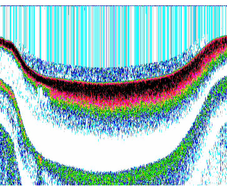 Figura 2 - Perfil típico da coluna de água da Lagoa Águas Claras obtido com a sonda Biosonics DT-X, no dia 25 de junho de 2008, pós-processado com o programa VBT da Biosonics, Inc. Os sedimentos da lagoa podem ser identificados pelas camadas em preto e vermelho. As partes mais profundas da coluna de água (logo acima dos sedimentos) estão totalmente colonizadas por larvas de chaoboridae (manchas em chuvisco na cor azul escuro). A ampla dominância de chaoboridae é uma característica comum às Lagoas Carioca e Àguas Claras. No entanto, os dipteros preferem ficar em zonas mais profundas durante o dia na Lagoa Àguas Claras como visto no perfil acima. É notável ainda que as populações de chaoboriade evitam ativamente a zona litorânea do lago. As linhas verticais em azul claro representam os pontos onde foram tomadas as medidas de profundidade, georeferenciadas.