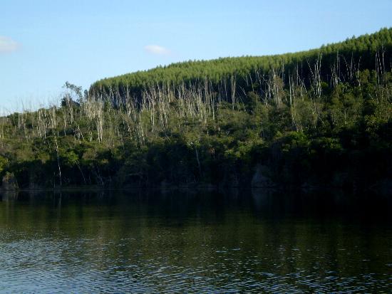 Figura 1 - Aspecto da zona litorânea da Lagoa de Águas Claras onde pode ser visto um cordão de vegetação nativa e logo em seguida a presença do monocultivo de Eucalyptus. O manejo dessa espécie arbórea pode estar associado a uma série de impactos na estrutura da comunidade planctônica. As maiores abundâncias de Ostracoda na coluna de água desses lagos podem ser um indício dessas alterações. No entanto, a forte presença de larvas de chaoboridae (diptera) nesses ambientes está provavelmente asssociada a um outro impacto ecológico: a presença de espécies exóticas de peixes (ver abaixo).