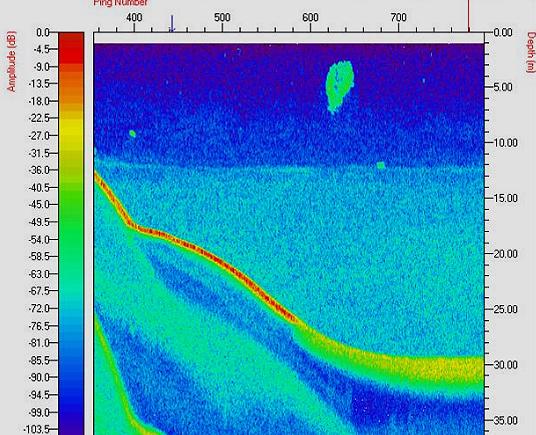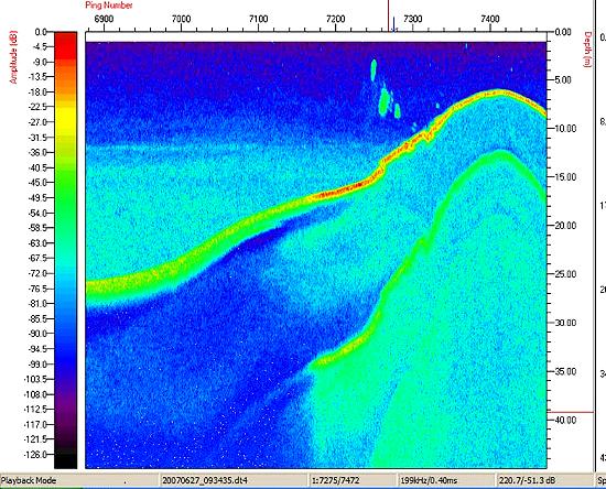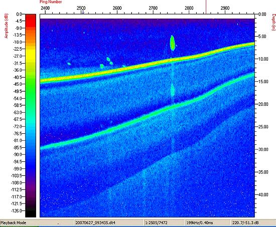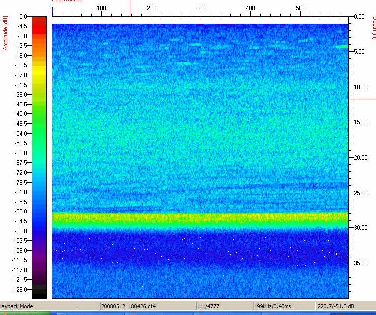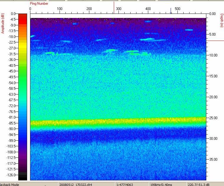 Um dos aspectos mais interessantes observado em nossa primeira excursão com a sonda DT-X ao lago D. Hélvécio, em junho de 2007, foi a constatação da existência de grandes cardumes de peixes na zona limnética do lago (Fig. 3). Esses cardumes somente puderam ser vistos no lago D. Helvécio, até o momento. Apesar de ter um sinal acústico que revela uma grande formação provavelmente com um grande número de peixes, nós ainda não sabemos a qual(ais) espécie(s) pertencem tais indivíduos. Em recente publicação, Espírito-Santo et cols (2007) evidenciaram, através de registros de comportamentos através de uma câmera submersa (SCAN), a presença de cardumes de peixes no lago D. Helvécio. Eles observaram o comportamento de formação de cardumes nas piranhas, no lambari (Astyanax bimaculatus) que, no entanto, tem densidades muito baixas no lago D. Helvécio. Os pesquisadores constataram que as piranhas mantém um nível muito elevado de atividade e sugerem ser o encardumamento uma característica plausível para a espécie.