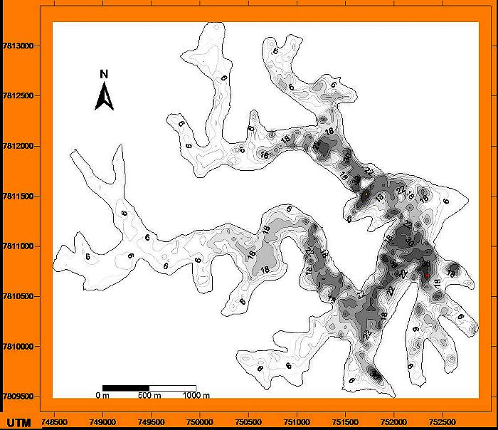 Figura 1 - Carta batimétrica (reduzida) do lago D. Helvécio. Em vermelho, o ponto mais profundo do lago (Bezerra-Neto & Pinto-Coelho, sub.)