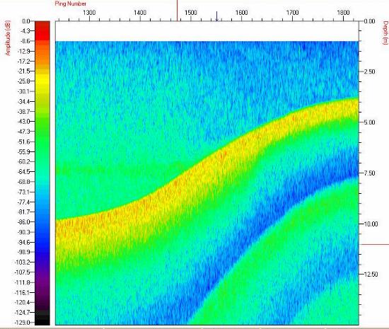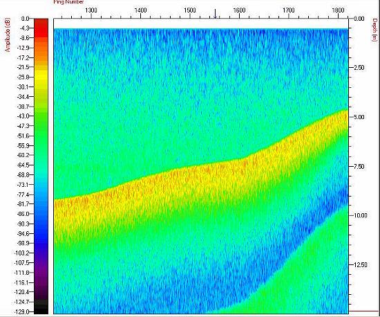 Figura 2 - Ecograma obtido com a sonda Biosonics DT-X com o transdutor posicionado na direção horizontal (em sub-superfície, 0,5 mtros), focando um banco de macrófitas (distante de 10 a 20 metros), às 11:47 horas do dia 13 de maio de 2008.