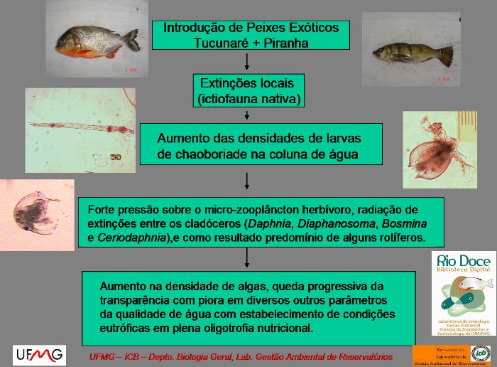 Figura 3 - Esquema original da teoria da "Cascata trófica invertida" originalmente apresentada por Ricardo M. Pinto Coelho no X Congresso Brasileiro de Limnologia, ocorrido em julho de 2005 em Ilhéus e posteriormente reapresentado no evento Biodiversity : The megascience in Focus. COP 08 Associated Meeting, 15-19 Março de 2006, Fundação Getúlio Vargas, Curitiba, Paraná.. Nesse evento, a teoria foi recebida com grande entusiasmo e foi, ao final, citada como um dos primeiros exemplos de estudos aplicados em Ecologia cujas conclusões podem ser imediatamente usadas para a adoção de planos de manejo da ictiofauna voltados para a recuperação da biodiversidade de unidades de conservação no Brasil.
