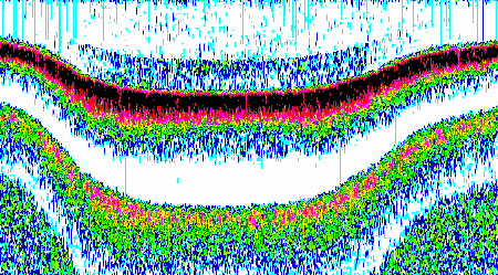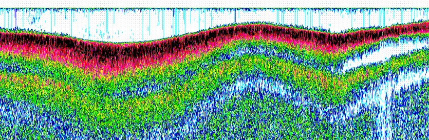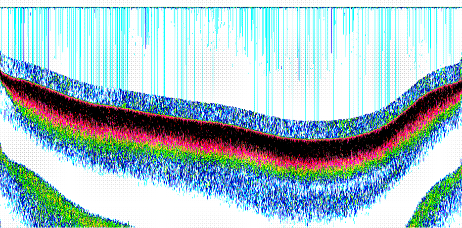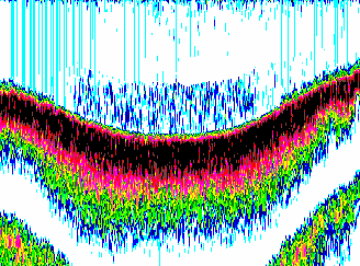 Figura 2 - Quatro perfils da Lagoa Jacaré ilustrando diferentes aspectos da distribuição espacial das larvas de chaoboridae. Em vermelho e rosa pode-se identificar os sedimentos lacustres. As linhas verticais em azul representam os pontos onde foram tomadas as profundidades do lago. É possível observar que as larvas ficam concentradas nas regiões mais profundas da zona limnética, evitando claramente a região litorânea do lago. A camada pontilhada em equenos riscos e chuviscos em azul logo acima dos sedimentos reflete os sinais acústicos refletidos pelas enormes densidades do diptero chaoboridae presente nessas regiões mais profundas da lagoa. Os dipteros evitam ativamente a zona litorânea da lagoa talvez por estarem mais sujeitos a predação tanto por peixes quanto por outros invertebrados (p. ex. por heteroptera neustônicos) nessas regiões (painel mediano). O painel mediano oferece um bom exemplo da capacidade da sonda Biosonics DT-X para mapear os bancos de macrófitas submersas que aparecem com grande nitidez nesse painel, logo acima dos sedimentos. Como todos esses dados são georeferenciados e temos todos os dados de profundidades, podemos igualmente gerar uma carta temática com precisão sub-métrica com todo o mapeamento de macrófitas da lagoa do Jacaré. Ao compararmos todos os painéis, fica evidente que existe uma relação de associação inversa entre a presença de marcófitas submersas e as densidades de Chaoborus