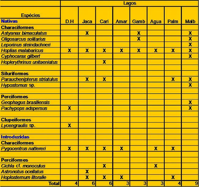 A lagoa do Jacaré, assim como vários outros sistemas lacustres da região, é uma lagoa que vem sofrendo muito com a introdução de espécies exóticas de peixes. Entre 2003 e 2006, fizemos um extenso levantamento da ictiofauna em um conjunto de lagos da região. Os resultados comprovam que a lagoa do Jacaré possui uma baixa riqueza de espécies de peixe e podem ser vistos na tabela a seguir: