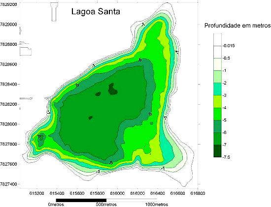 Figura 2 - Carta batimétrica da Lagoa Central (Lagoa Santa) obtida pela ecosonda OHMEX com dados de coordenadas geográficas obitdas pelo D-GPS Tech Geo. Carta elaborada por Alan Vieira.