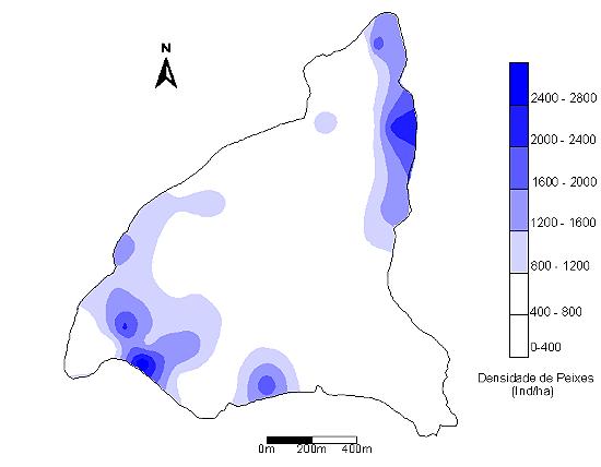 Essas pesquisas geraram uma massa de dados que fez com que o bolsista de PD (FAPEMIG) Dr. José Fernandes Bezerra Neto produzisse a primeira carta temática com as estimativas espaciais de densidades de peixes na Lagoa Central (Lagoa Santa). Essa carta (figura abaixo) e a carta das densidades de peixes da represa da Papulha são as primeiras cartas temáticas feitas através de varredura hidroacústica em lagos e reservatórios brasileiros (Fig.4).