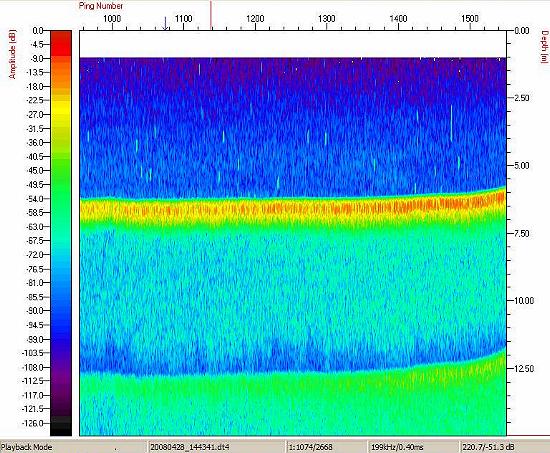 No dia 28 de abril de 2008, fizemos uma série de transectos com o objetivo de gerar uma carta temática das distribuições das densidades de peixes na Lagoa Central. A figura abaixo ilustra um dos ecogramas obtidos durante essa excursão (Fig. 3).