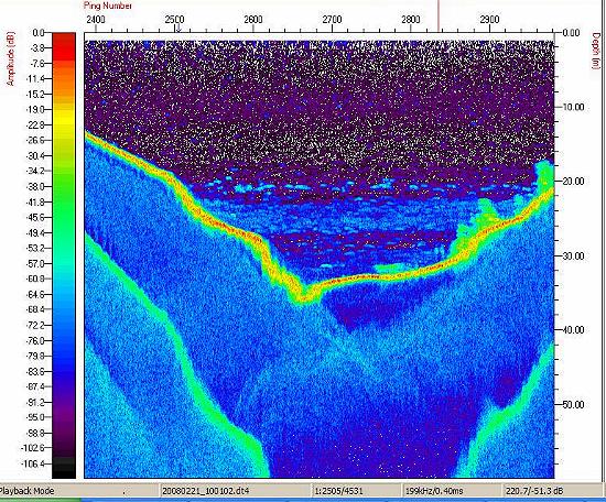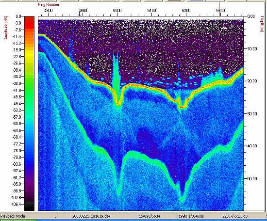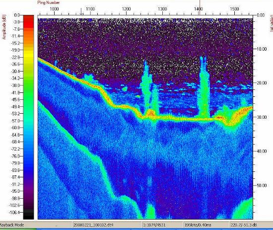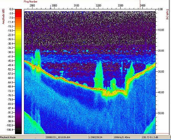 Os estudos com a sonda Biosonics no reservatório de Nova Ponte foram realizados no dia 21 de fevereiro de 2008. Os principais objetivos foram: (a) estudar os sedimentos de um braço do reservatório onde está sendo implantado um projeto de tanques-rede; (b) estimar as densidades de peixes no braço do reservatório. Os ecogramas abaixo mostram diferentes aspectos do local estudado, onde se destacam as elevadas densidades de peixes, encontrados sempre em um único estrato de profundidade, a aproximadamente a 20-25 metros de profundidade. Os ecogramas também revelaram a complexidade do relevo do fundo do braço identificando os locais onde a estrutura básica da vegetação ripária permanece ainda praticamente itacta no fundo do reservatório.