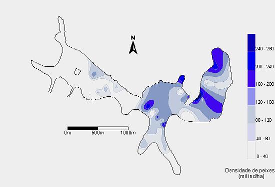 Figura 2 - Estimativa da densidade de peixes (tilápias) na represa da Pampulha. Observar que as maiores densidades ocorrem nas regiões mais profundas do reservatório e chegam ao patamar de masi de 240.000 indivíduos por ha. Entendemos que as elevadas densidades de tilápias observadas nesse ambiente podem estar contribuindo para uma sensível piora das condições limnológicas do ambiente principalmente em termos de déficit de oxigênio, teores de amônio e principalmente pela excreção do fósforo, elemento limitante para a produção primária do ambiente. A recuperação da qualidade de águia da represa irá passar necessariamente pelo manejo ecológico das populações de tilápias. Gráfico feito por Bezerra-Neto e já publicado em reportagem especial do Estado de Minas em 22 de junho de 2008. As estimativas foram feitas através dos programas Visual Analyzer (Biosonics, Inc.) e Surfer 8.0 (Goldman, Inc.)