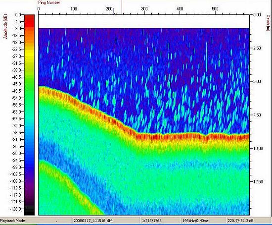 Figura 1 - Ecograma obtido no dia 17 de maio de 2008 na represa da Pampulha, região próxima ao Iate Tênis Clube. O ecograma sugere que existe uma grande densidade de peixes, concentrados, sobretudo nas regiões mais profundas do lago. Esse padrão de distribuição espacial seja talvez uma resposta comportamental dos peixes para evitar a pressão de predação exercida pelos biguás que ocorrem em grande número no local. Estudos anteriores revelaram que as tilápias são praticamente os únicos peixes que existem em grandes densidades na represa. Portanto, os peixes que são vistos no ecograma devem muito provavelmente ser exemplares de tilápias. O ecograma acima foi obtido com o software Visual Acquistion (Biosonics, Inc.)