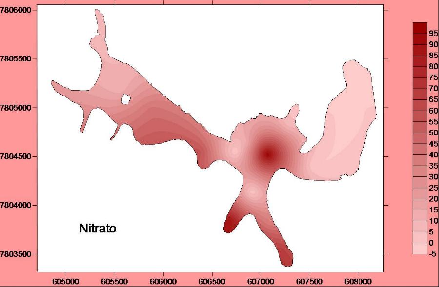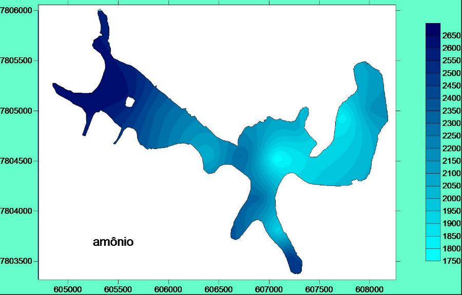 No mesmo dia em que fizemos a segunda varredura com a sonda hidroacústica na represa da Pampullha, fizemos também um inventário bastante preciso das demais condições limnológicas da represa. Amosrtas de água foram tomadas em 15 diferentes pontos, na sub-superfície para análises de nitrato, amônio, fósforo total, clorofila-a, sólidos em suspensão e turbidez. Em cada ponto foi feito ainda medidas de temperatura, condutividade e oxigênio dissolvido na coluna de água. A seguir (Figs. 3,4,5 e 6), apresentamos as cartas temáticas desse estudo.