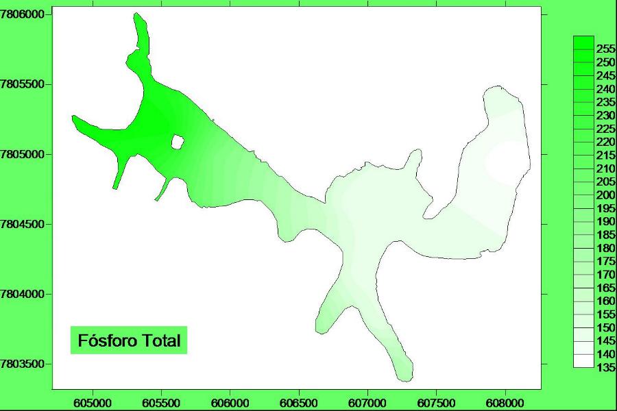Figura 5 - Cartas temáticas com as concentrações sub-superficiais de clorofila-a (ug.l-1) e fósforo total (ug.l-1) na represa da Pampulha, em junho de 2008. A coluna de água estava istotérmica no dia da coleta e, portanto, não havia estratificação na coluna de água. As coletas de dados e a confecção das cartas teméticas foram feitas pelos alunos do curso "Ecologia de Comunidades", do programa de pós-graduação em Ecologia, Conservação e Manejo da Vida Silvestre da UFMG. As análises de laboratório foram feitas pelo técnico Cid Antônio Morais, Jr, no Laboratório de Gestão Ambiental de Reservatórios, ICB, UFMG. Todas as cartas temáticas foram geradas pelo software Surfer 8.0, usando uma máscara do perímetro (arquivo shapefile) da represa criada e calibrada pelo Lab. Gestão Ambiental, ICB, UFMG, com precisão sub-métrica.