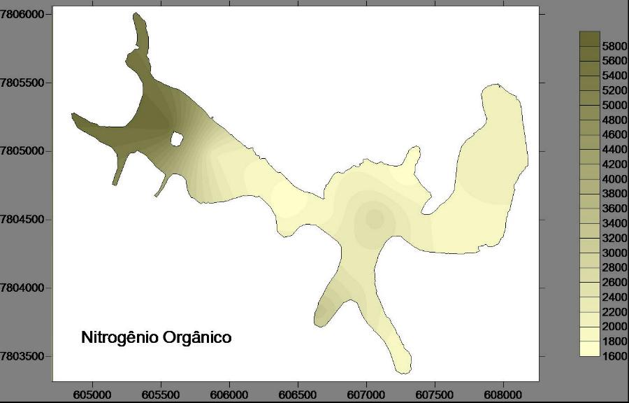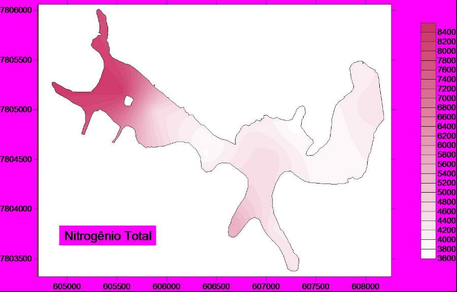 Figura 4 - Cartas temáticas com as concentrações sub-superficiais de nitrogênio total (ug.l-1) e nitrogênio oirgânico (ug.l-1) na represa da Pampulha, em junho de 2008. A coluna de água estava istotérmica no dia da coleta e, portanto, não havia estratificação na coluna de água. As coletas de dados e a confecção das cartas teméticas foram feitas pelos alunos do curso "Ecologia de Comunidades", do programa de pós-graduação em Ecologia, Conservação e Manejo da Vida Silvestre da UFMG. As análises de laboratório foram feitas pelo técnico Cid Antônio Morais, Jr, no Laboratório de Gestão Ambiental de Reservatórios, ICB, UFMG. Todas as cartas temáticas foram geradas pelo software Surfer 8.0, usando uma máscara do perímetro (arquivo shapefile) da represa criada e calibrada pelo Lab. Gestão Ambiental, ICB, UFMG, com precisão sub-métrica.