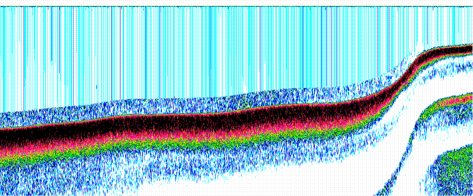 A figura abaixo ilustra um perfil tomado com a sonda Biosonics DT-X no dia 25 de junho de 2008 na lagoa de Águas Claras. O processamento dos dados foi feito com o software Bottom Analyzer que descreve uma série de características do sedimento além de gerar um arquivo com as coordenadas pós-corrigidas pelo D-GPS Trimble sincronizadas com as profundidades. Tais dados são essenciais para a confecção da carta batimétrica do lago, passo fundamental para todas as análises subsequentes sobre a distribuição espacial da ictiofauna no ambiente.
