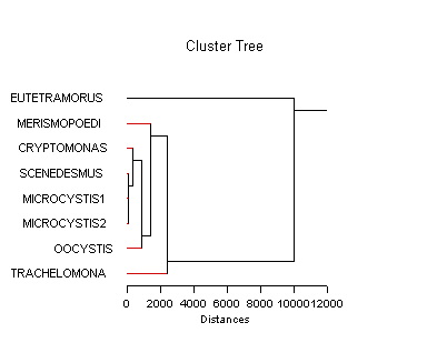 4) Agora que você já aprendeu um pouco sobre as nossas algas, faça uma classificação nos dados acima. O conhecimento da biologia e ecologia das algas será essencial para a correta interpretação dessa análise. Nós vamos usar aqui um método hierárquico (veja à página 72) . Quanto ao método de ligação (veja à página 77), usaremos, nos exemplos a seguir, o método do " vizinho mais próximo" e o "método do vizinho mais longíquo". A questão central agora é a escolha de um bom coeficiente de similaridade. Usaremos aqui dois coeficientes binários (veja outros a página 65): a distância euclidiana que vai ser extremamente influenciada pelas densidades. Depois vamos trabalhar com o coeficiente de Pearson uma vez que ele é muito usado em Ecologia sendo menos influenciado por valores extremos (veja a tabela 5.8 na pág. 68).