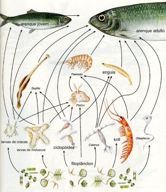 Uma das definições mais usadas em Ecologia é aquela dada por Krebs (livro pag. 12). Segundo o autor, a Ecologia pode ser definida como sendo o estudo dos fatores que determinam a distribuição dos organismos no tempo e espaço. Para entendermos essa distribuição dos organismos no tempo e no espaço, precisamos de entender o que os organismos estão fazendo em seu habitat. Uma das funções mais importantes dos organismos é a sua nutrição que provê os recursos necessários para as demais funções entre elas a reprodução. O estudo da ecologia trófica vem sendo desenvolvido desde o início da Ecologia. Teias e cadeias alimentares são uma das formas mais usadas para representar as relações tróficas entre as espécies que compõem um ecossistema. Em nosso livro, o tema é introduzido no capítulo 14. Abaixo fornecemos uma representação mais pictorial da teia alimentar do arenque no mar do norte. Essa teia foi publicada por Hardy (1924) e a versão apresentada a seguir foi modificada e traduzida de Sumich (1999).