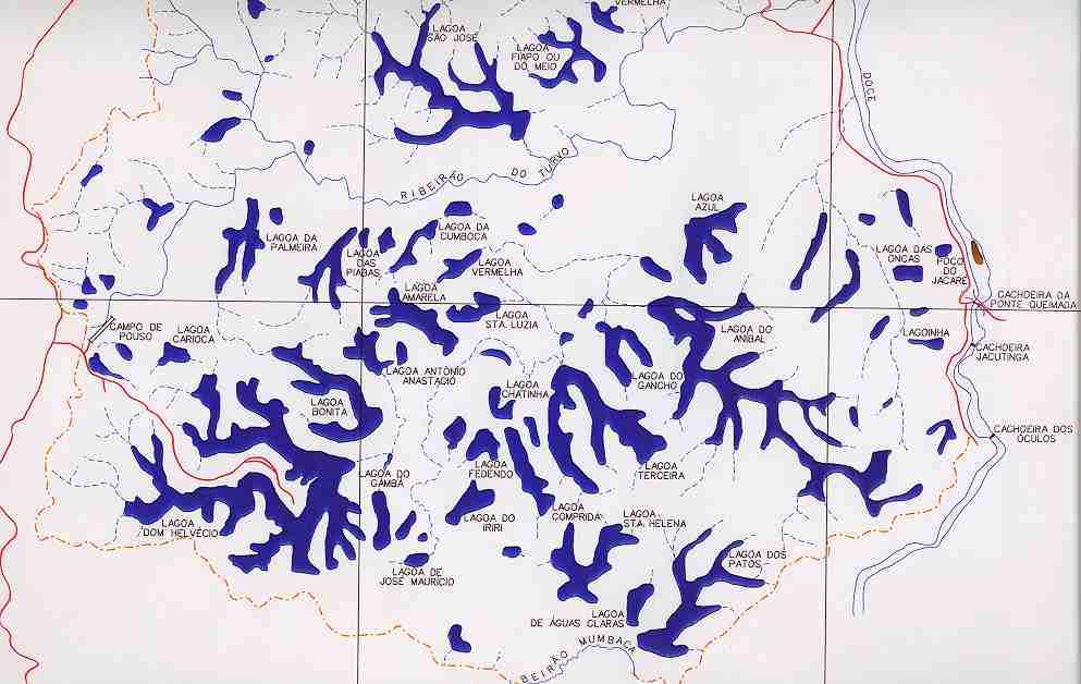 Figura 3 - Mapa ilustrando algumas das lagoas encontradas no Parque Estadual do Rio Doce. As lagoas do Bispo, Carioca e Gambazinho podem serem vistas no mapa.