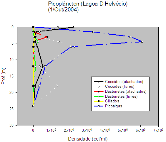 Figura 1 - Perfil de densidades de alguns grupos de organismos do picoplâncton na Lagoa D. Helvécio, em outubro de 2004.